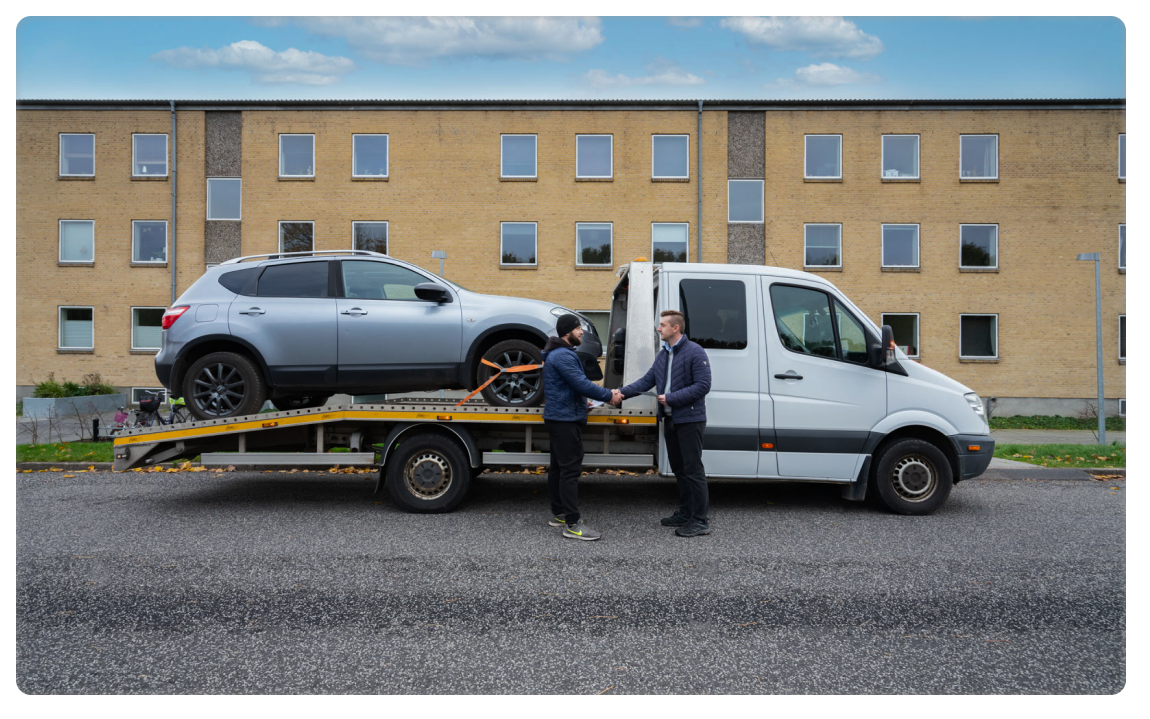Autotrailer kommer på aftalt tidspunkt for at hente din bil. Du må gerne selv aflevere bil og får tillæg til købesum